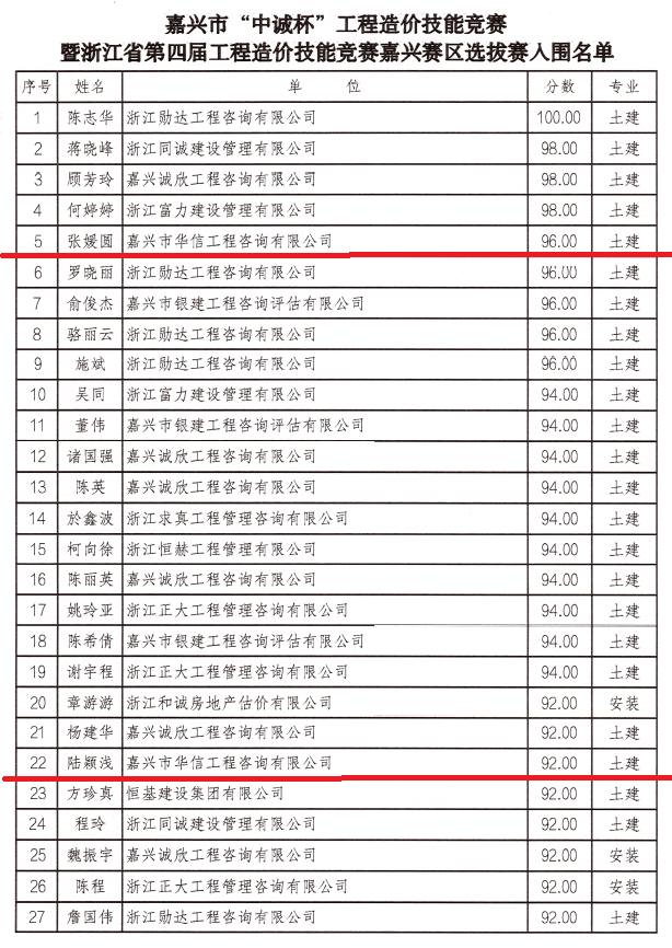附件:嘉興市“中誠杯”工程造價技能競賽暨浙江省第四屆工程造價技能競賽嘉興賽區選拔賽入圍名單